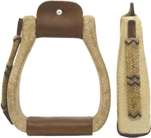 Braided rawhide stirrups with metal bound wood center, 2" tread, 4 3/4" wide. Sold in pairs.